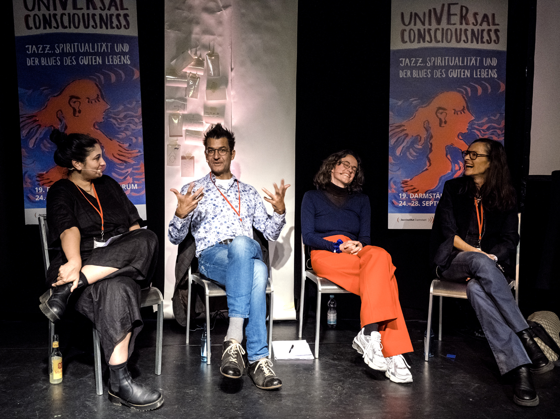 Von Arne Schumacher. Gibt es Themenkonferenzen, bei denen man am Ende das Gefühl hat, dass keine wesentlichen Fragen offen geblieben sind? Falls ja: Das 19. Darmstädter Jazzforum, ausgerichtet vom rührigen Jazzinstitut Darmstadt, gehörte definitiv nicht dazu. Im Zuge der mehrtägigen, programmlich üppig aufgestellten Zusammenkunft – auch Workshop, Filmreihe, Konzerte gehörten dazu – bildete sich ein Mosaik, das viele Motive anbot, aber kein sonderlich klares Bild ergab. Dabei hatte die Überschrift „Universal Consciousness“ zumindest die Hoffnung auf etwas geistige und emotionale Orientierung, vielleicht auch Momente der Erleuchtung in Zeiten der mehrfach erwähnten „Poly-Krise“ genährt. Der Untertitel brach das Alice-Coltrane-Zitat ein Stück weit auf: „Jazz, Spiritualität und der Blues des guten Lebens“ sollte den Bogen von esoterisch Angehauchtem zum herausfordernden Jazz-Alltag vorgeben.